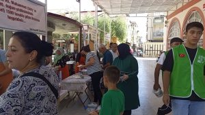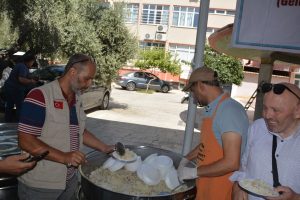 İHH Nazilli temsilcisi Ömer Taşkıran ve vakıf üyelerinin ev sahipliğindeki hayra vatandaşlar yoğun ilgi gösterdi, kazanların önün uzun kuyruklar oluştu.